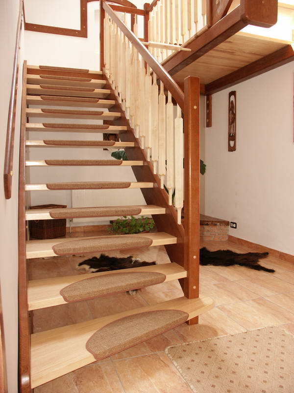Scară dreaptă executată din lemn de paltin băițuit în două culori și cu balustradă din lemn.